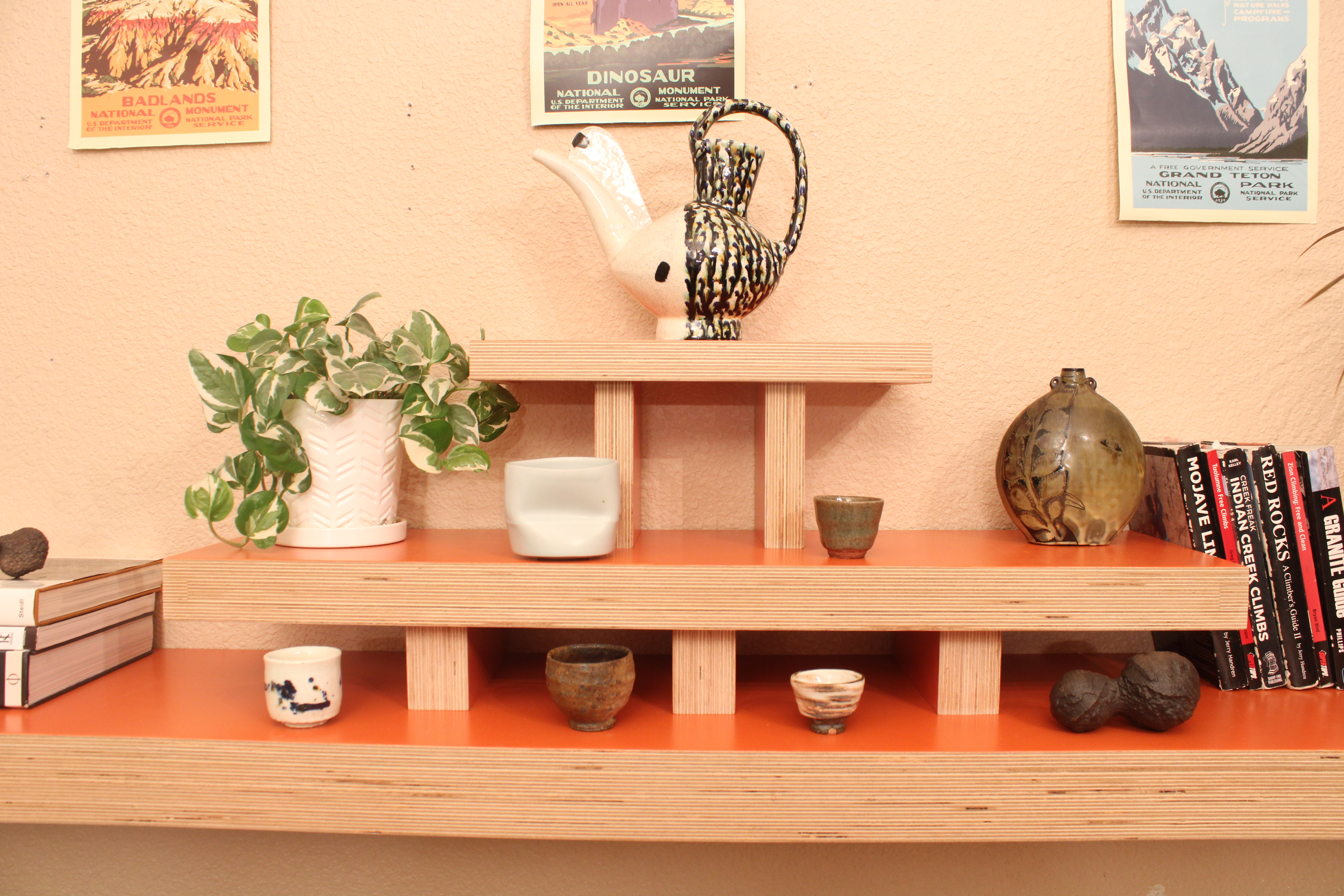 The Pagoda Shelf was made in a series of shelves in an effort to explore shelves as shrines for objects. Shelves are for displaying, so we tried to distill this idea and create a formal language that reinforces this idea. The elevated planes and sequentially diminishing proportions have an almost religious connotation. The alter in a church, Mayan temples, and or course the roofs of a pagoda. We universally understand this formal language of elevation and when applied to shelving it creates a shrine like display for the objects in your home.